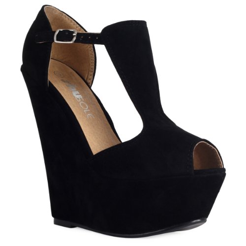 Check Here for Customer Reviews and Buy with Special Price DD5 Womens Black Faux Suede T-bar Peep Toe Ladies Platform Wedge High Heel Party Shoes Size 4