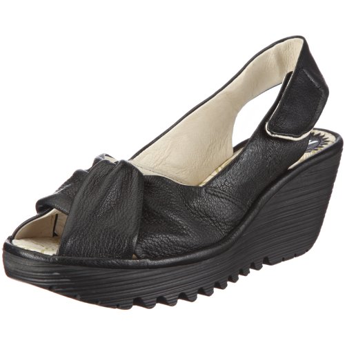 Fly London Women's Yakin Black Open Toe Heel P500124020 5 UK - Fly London Shoes Yakin on the ever popular wedge sole. An open toe slingback sandal with a softee leather knotted upper and feature printed sock.