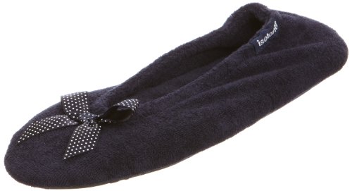 Isotoner Women's Double Bow Terry Ballet Slippers Navy/White Spot Outdoor Sole 98968NWSL Large - An isotoner classic - the 4-way stretch cotton rich terry ballerina slipper features our unique patented Pillowstep tufted cushioned insole for extra comfort, plus this great little ballerina slipper has a durable sole and is also machine washable.