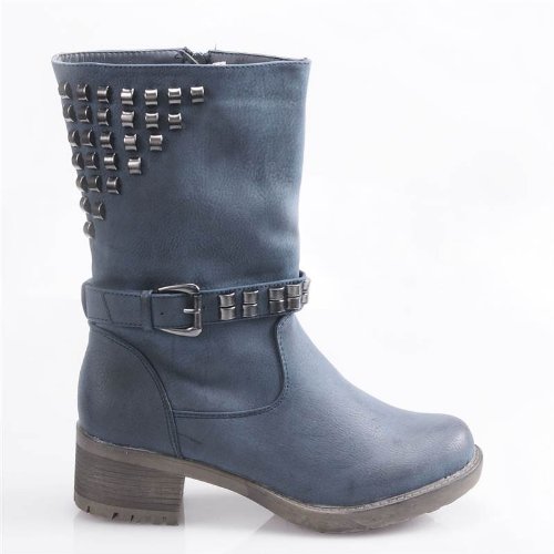 Check Here for Customer Reviews and Buy with Special Price LADIES CHUNKY/STACKED/BLOCK HEEL WORN LEATHER LOOK STUDDED BIKER BOOTS/SHOES [ BLUE - 7 ]