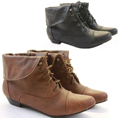 Ladies Womens Brown Black Vintage Style Lace up Winter Low Heel Short Flat Pixie Ankle Boots Size 3-8 - Check our storefront to view our fantastic range of trendy footwear.