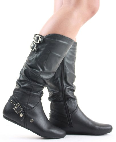 Womens Flat Black Winter Biker Style Low Heel Knee High Ladies Calf Leg Boots Size with shoeFashionista Boutique Bag - shoeFashionista products are only available exclusively through shoeFashionista