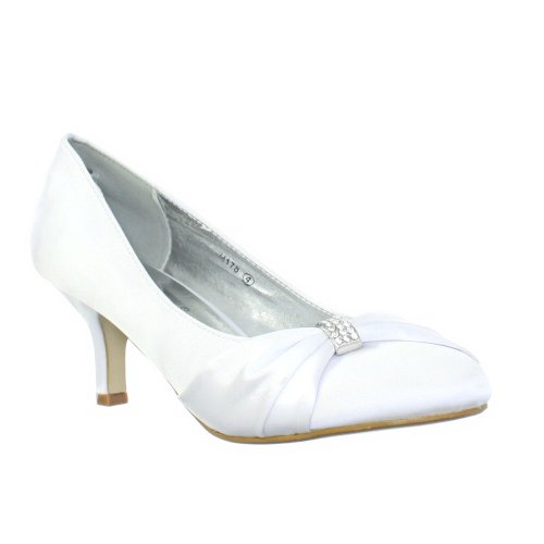 - Key Features:Satin Wedding Shoes, rounded toes, diamante feature, white satin, low heel